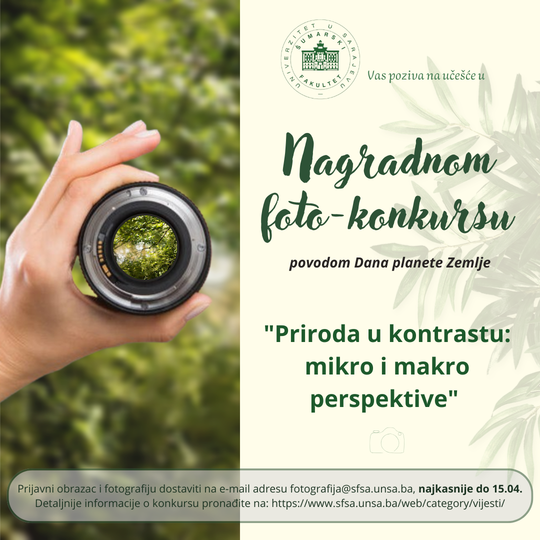 Učenici srednjih škola i studenti se pozivaju da dostave svoje radove na Nagradni konkurs za najbolju fotografiju u povodu 22.04.2025 Dana planete Zemlje, koji organizuje Univerzitet u Sarajevu – Šumarski fakultet.